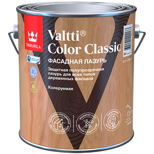 Защитная полупрозрачная фасадная лазурь ТИККУРИЛА Валтти Колор Классик бесцветная 2,7 л применяется для обработки наружных стен, заборов, необработанных или ранее обработанных фасадной лазурью деревянных конструкций. Предназначена для обработки бревенчатой, пиленой и строганной деревянной поверхности, а также разного рода деревянных плит, пропитанной под давлением и термообработанной древесины снаружи домов. Не применяется для OSB плит. Не применяется для обработки внутренних поверхностей теплиц.
